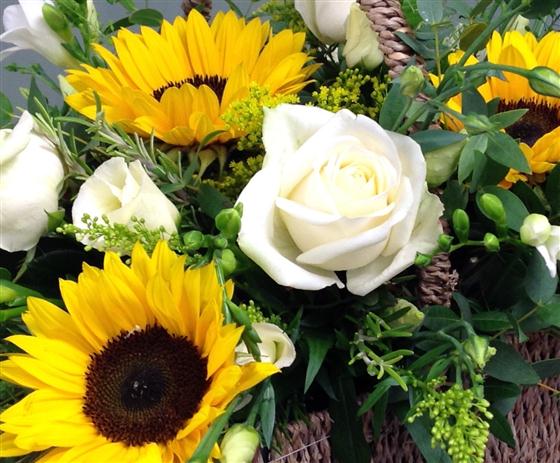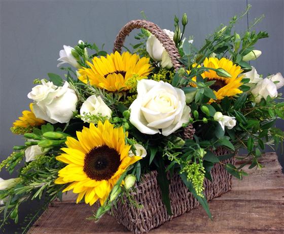 Classic cheerful basket with sunflowers, white roses and freesias.