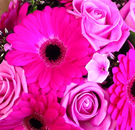 For an immediate impact this choose this striking bunch of hot pink gerberas, aqua roses and phlox.