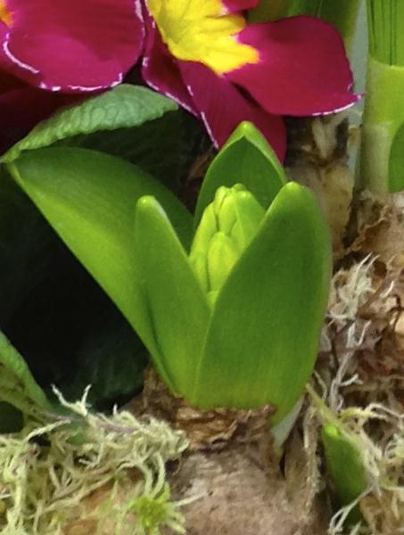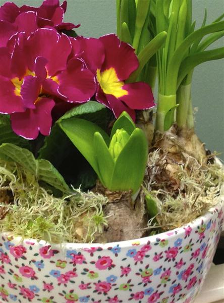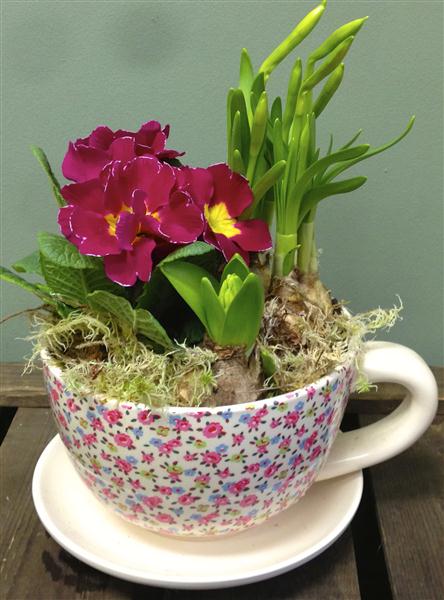 Ceramic floral tea cup and saucer with spring bulbs.