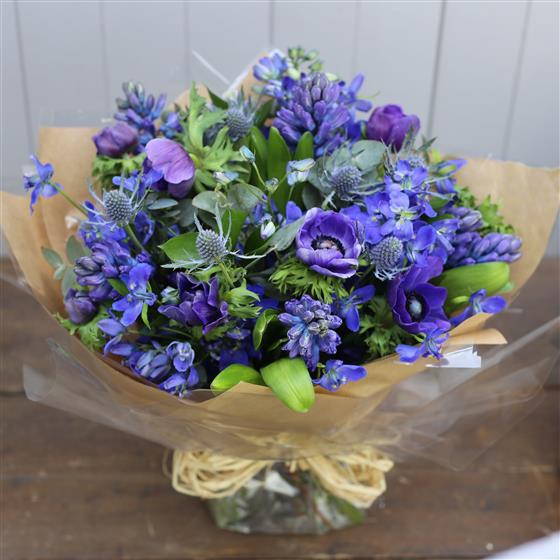 A hand tied bouquet made of true blue flowers and complimenting foliage.