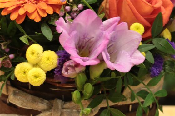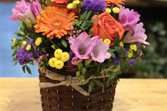 A bright and cheerful basket arrangement of oranges, purples and golds including mini gerberas, roses, statice and scented freesia.