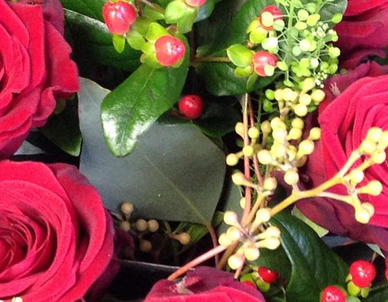 Two dozen top quality velvety red roses interspersed with berries and thalaspi foliage. The best you can buy!