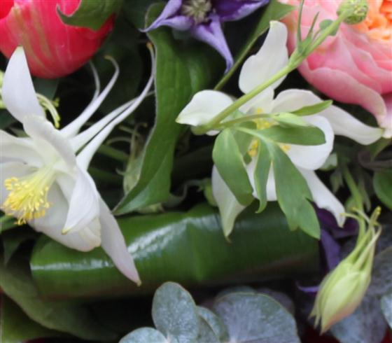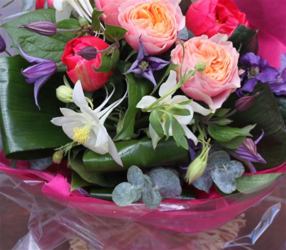 Hand tied bouquet including wonderful vuvuzella roses and seasonal complementary blooms.