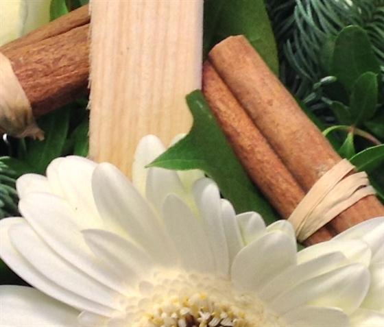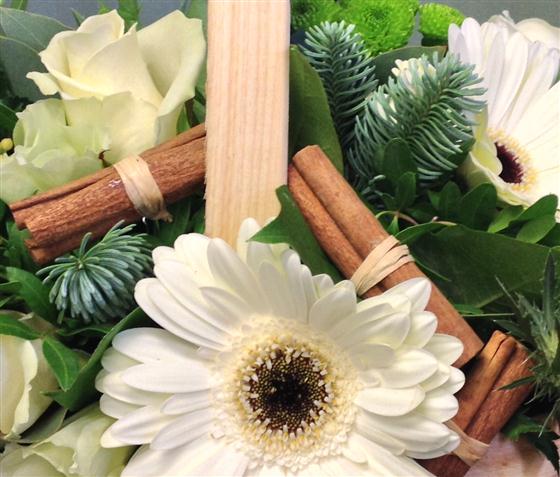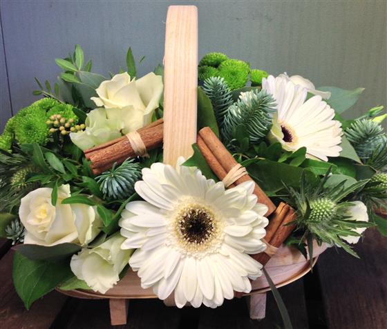 A winter white trug basket arrangement including roses, gerberas, blue spruce and cinnamon sticks. Delightful!