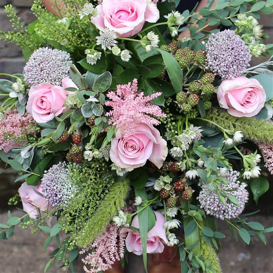 A hand tied of large headed pale pink roses and wild country flowers to suit.