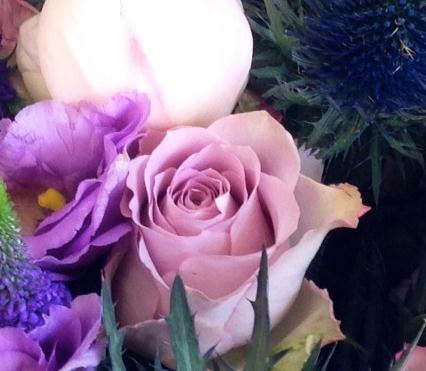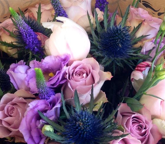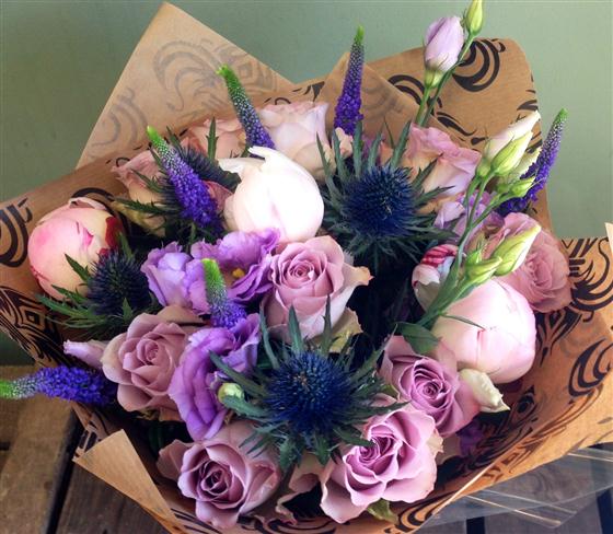 Soft lilacs and deep purples create this special hand-tied bouquet. A pretty choice.
