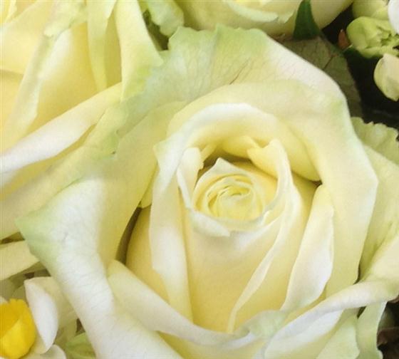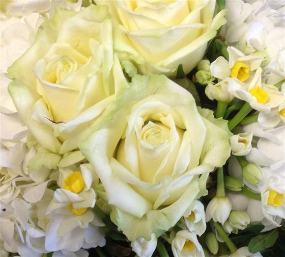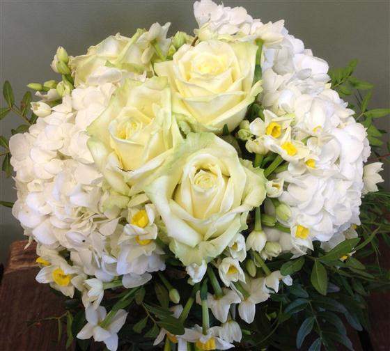 A stunning hand-tied bouquet with of large white roses, white hydrangeas and narcissus to give a delicate fragrance.