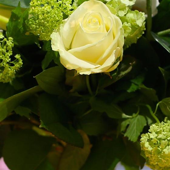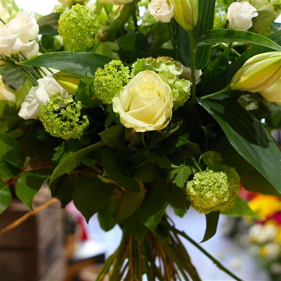 Classy whites and greens combine in this lavish hand tied bouquet of roses, scented lilies and viburnum.
